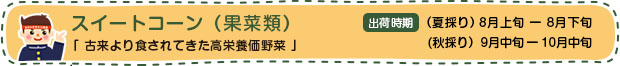 とうもろこしにはスイートコーンをはじめ、ポップコーンの原料になる爆粒種や、主にコーンスターチなどでんぷんを利用する穀物種、家畜の肥料になるものなど様々な品種があります。スイートコーンは実に含まれる糖分が多いとうもろこしの品種(甘味種)で、一般的に食用とされているものです。年々品種改良が進み、より甘味が強く、生のまま食べられる物も増えてきています。