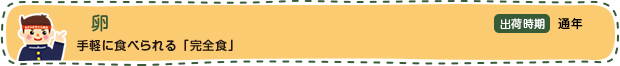 たんぱく質を構成するのは20種類のアミノ酸。その中で食事からとらなければならない8種類のアミノ酸のことを「必須アミノ酸」と言います。卵にはこの必須アミノ酸がバランスよく含まれており、そのほかにも人間の体に必要な栄養素をまんべんなく含んでいる「完全食品」です。