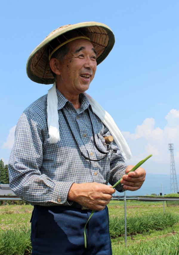 行者菜の生産者、遠藤孝太郎さんたちが行者菜と出会ったのは10年ほど前。宇都宮大学で行われた「だいこんサミット」で、行者菜開発グループの宇都宮大学助教授 藤重宜昭氏と出会い、行者菜についてお聞きしたのがきっかけでした。実際に行者菜を食べてみると、その香りの強さに驚き、遠藤さんたちは行者菜を作りたいと申し出ました。しかし、誰でも作っていいというものではなく、“行者にんにくが自生しているような場所で、そこの産品として山菜に近い位置づけで作ってほしい” という開発者の思いがありました。そこで遠藤さんたちは長井市にあった行者にんにく生産組合を訪ね、協力を得ることができ、平成18年に生産を開始したのです。