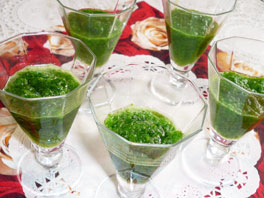行者菜を食べると体が活性化されます。遠藤さん曰く、その効果が一番わかるのは「行者菜ミックスジュース」。行者菜をミキサーにかけ、リンゴジュースとオレンジジュースを加え、水で好みの濃さにして完成です。これを杯(さかずき)一杯飲むと、お酒を飲んだように体が温まるのだとか。