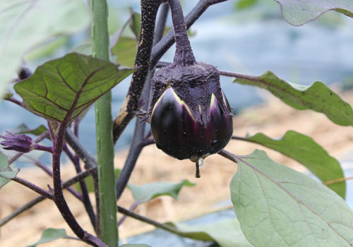 窪田なすの種は、漬物の販売を行う『三奥屋』さんが提供してくれるのだとか。3cmほどの大きさで収穫し、へたを取った状態で三奥屋さんに出荷し、こうじ漬けやからし漬けに加工され、販売されています。漬物にするには、このくらいのサイズにすることで窪田なす独特のぱりっと固い食感が残るのだとか。