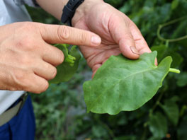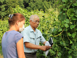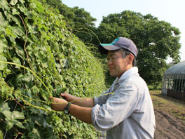 雲南百薬はとても成長が早いため、上からどんどん覆いかぶさってきて、放っておくと30mにもなります。それを取りながら、きちんと葉っぱが大きくなるように育てます。それだけ成長が早い野菜ですから、大量の肥料を必要とします。その量は果樹にも匹敵するほど!そして肥料と同じくらい重要なのは水です。雲南百薬は水に弱いため、水はけのよい土地でないと根腐れや病気が発生してしまいます。