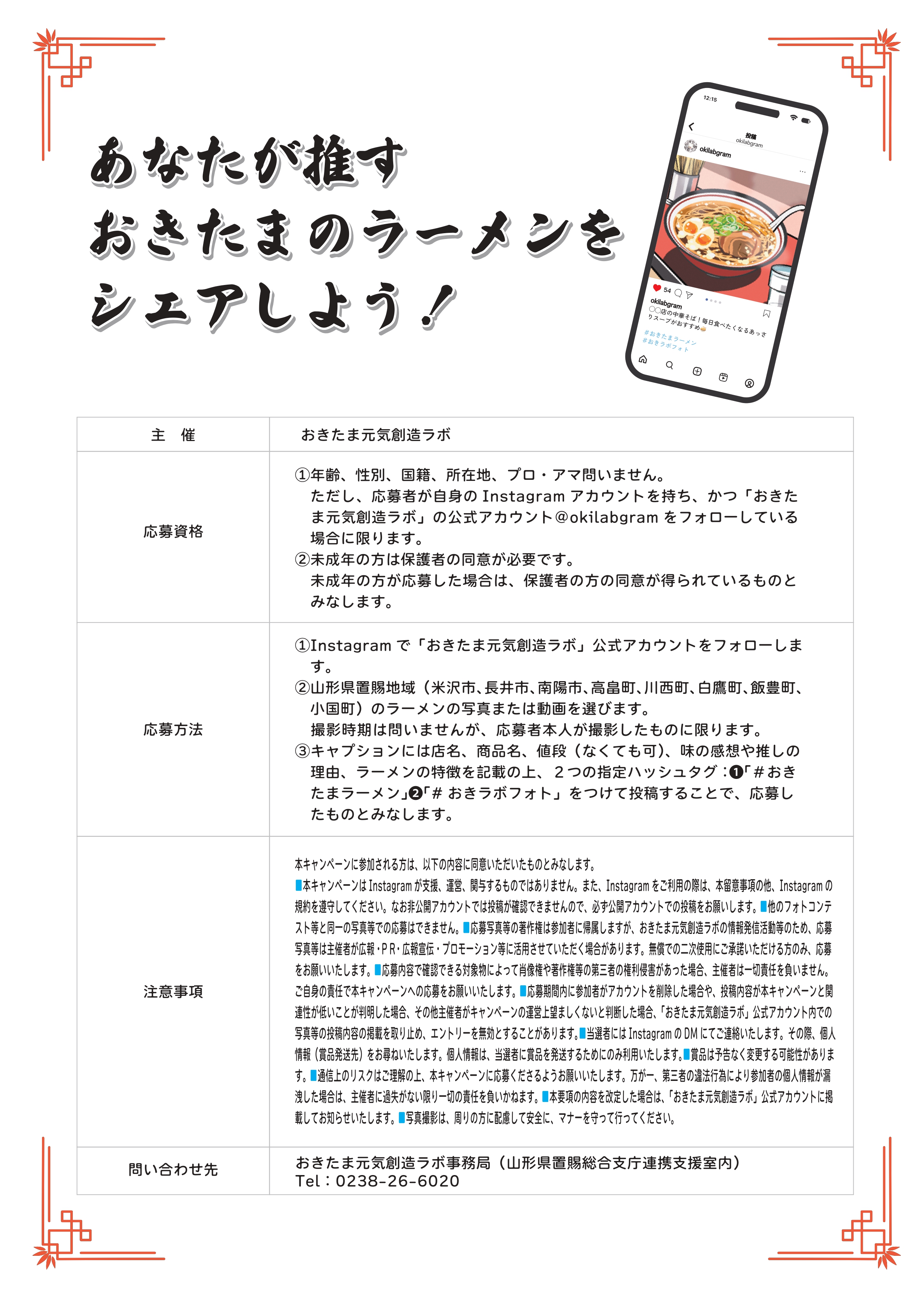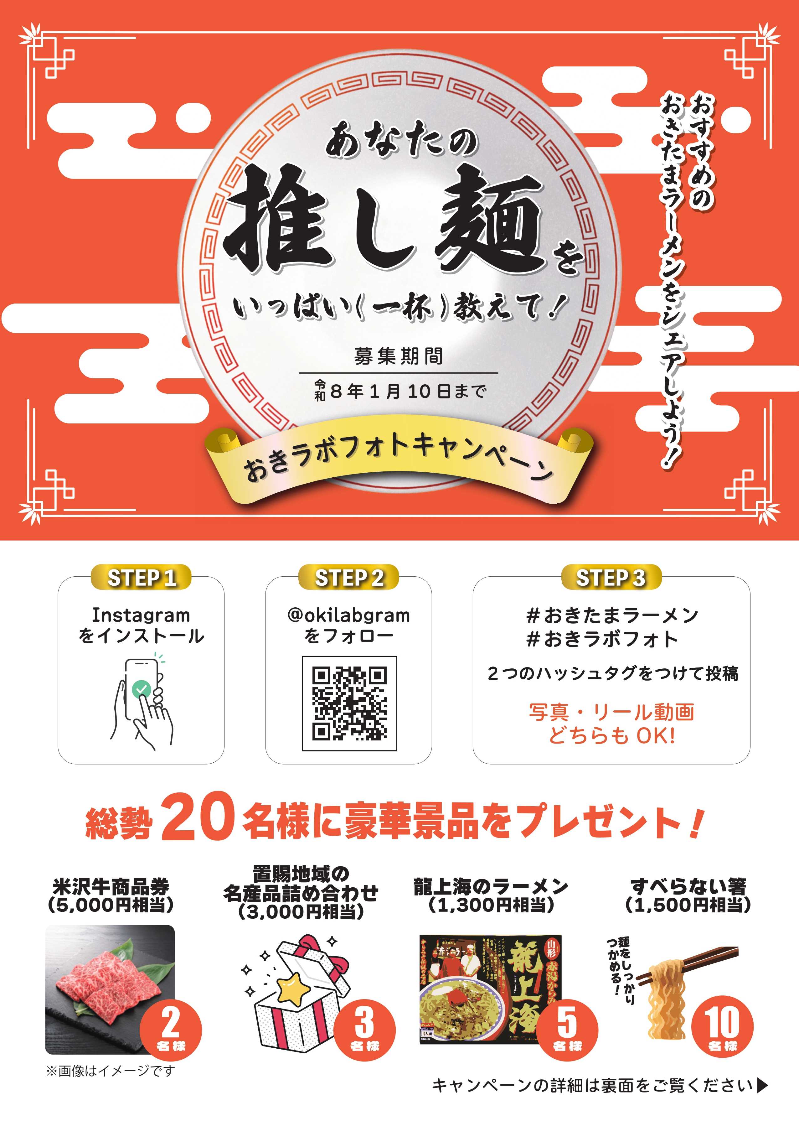 指定のハッシュタグ #おきたまラーメン #おきラボフォト を添えて投稿してください!
