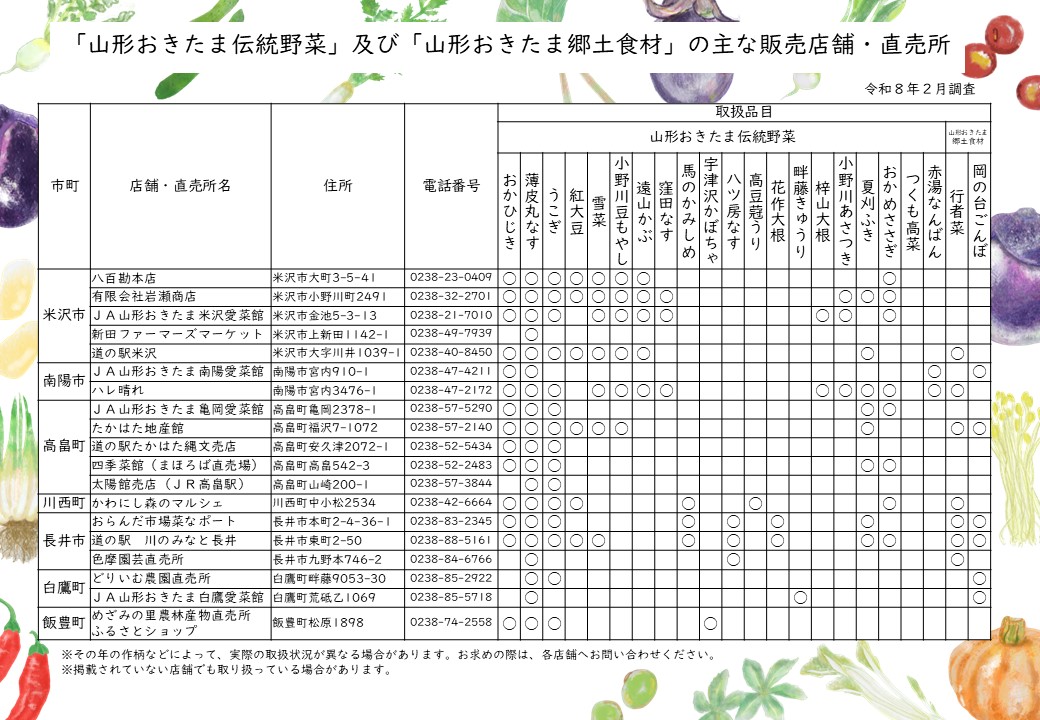 「伝統野菜を食べてみたいけど、どこで買えるの?」皆さまからお問い合わせが多いこのご質問にお答えするため、「山形おきたま伝統野菜」と、「山形おきたま郷土(ふるさと)食材」の主な販売店舗・直売所の情報を更新しました。↑画像をクリックすると、PDFファイルが開きます。その年の作柄などによって、各お店での取扱状況が掲載の情報と異なる場合がありますので、お求めの際は、各店舗にお問い合わせくださいね。なお、各品目の出荷時期は、「おきたま旬の食材カレンダー」をご覧ください。